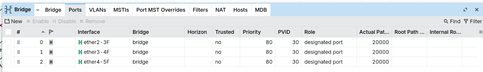 首先,由於在 RouterOS 中,每個 port 都可以獨立運作,因此並沒有先天的 WAN / LAN port 之分。在我先前的架構中,我是讓每個 port 各自是一個 LAN。然而到了這個新架構下,我需要讓每層樓的 AP 都屬於同一個內網中,因此需要設定 bridge 來建立一個路由器中的「軟體交換器」。