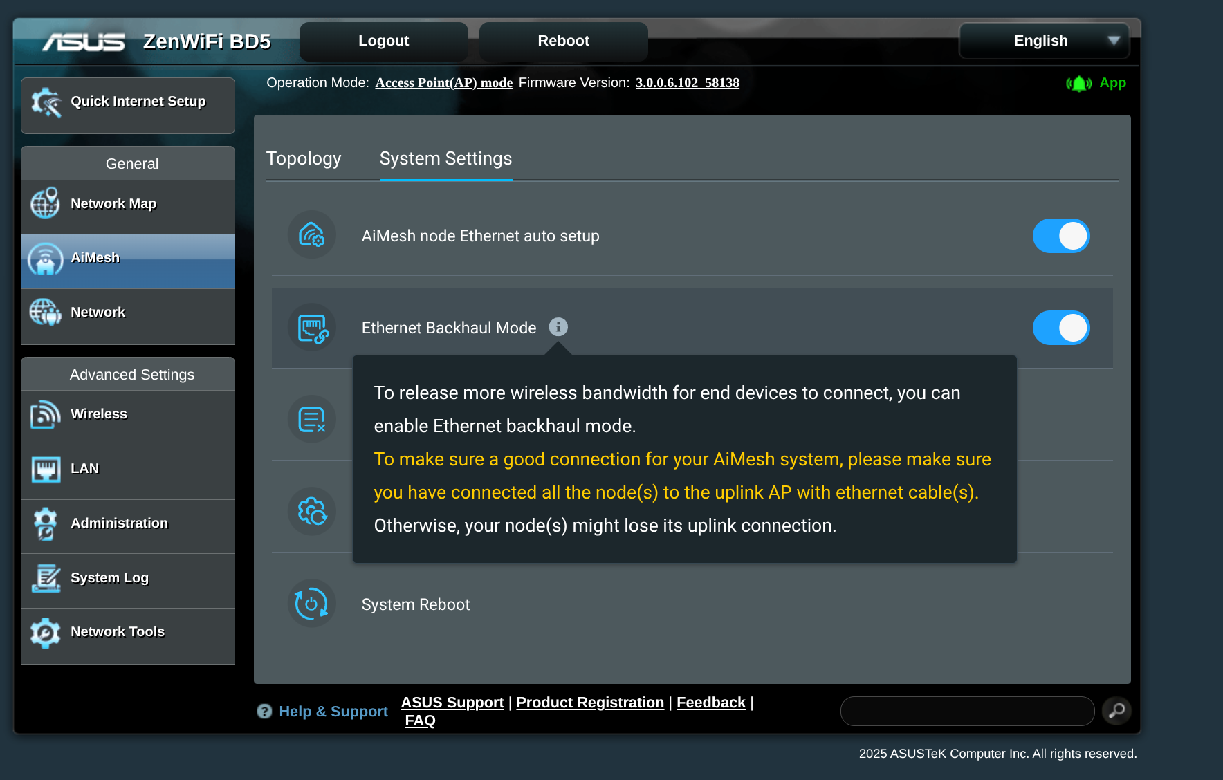 先打開剛才綁定好的基地台 IP,我的是 http://192.168.20.12 ,登入後到 AiMesh / System Settings 的地方,啟用 Ethernet Backhaul Mode,接著讓系統重開。
