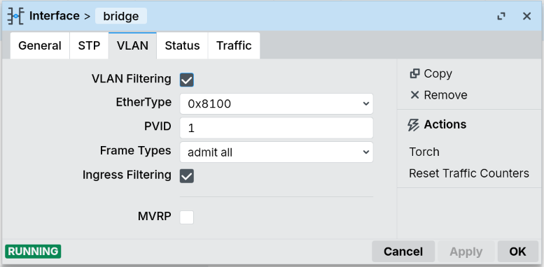 最後,將 bridge 的 VLAN Filtering 開啟。Bridge 本身的 PVID 保持預設值 1 即可,因為我們使用 VLAN interface 來處理各個網段,而不是直接讓 bridge interface 參與通訊。按下 Apply 後,VLAN 就會開始工作了。